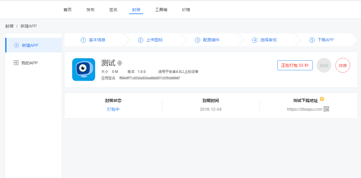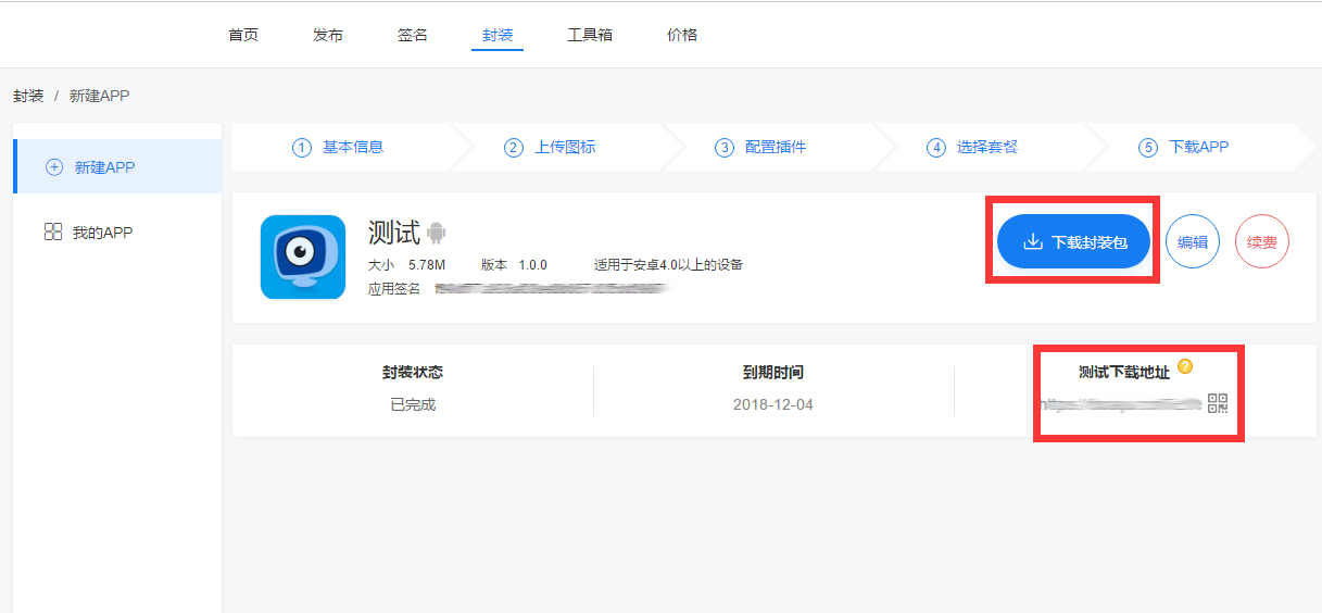 封装完成后,点击“下载封装包”,把包存在本地电脑上,然后点击【发布】,把APP上传到发布平台,就可以有正式下载链接。